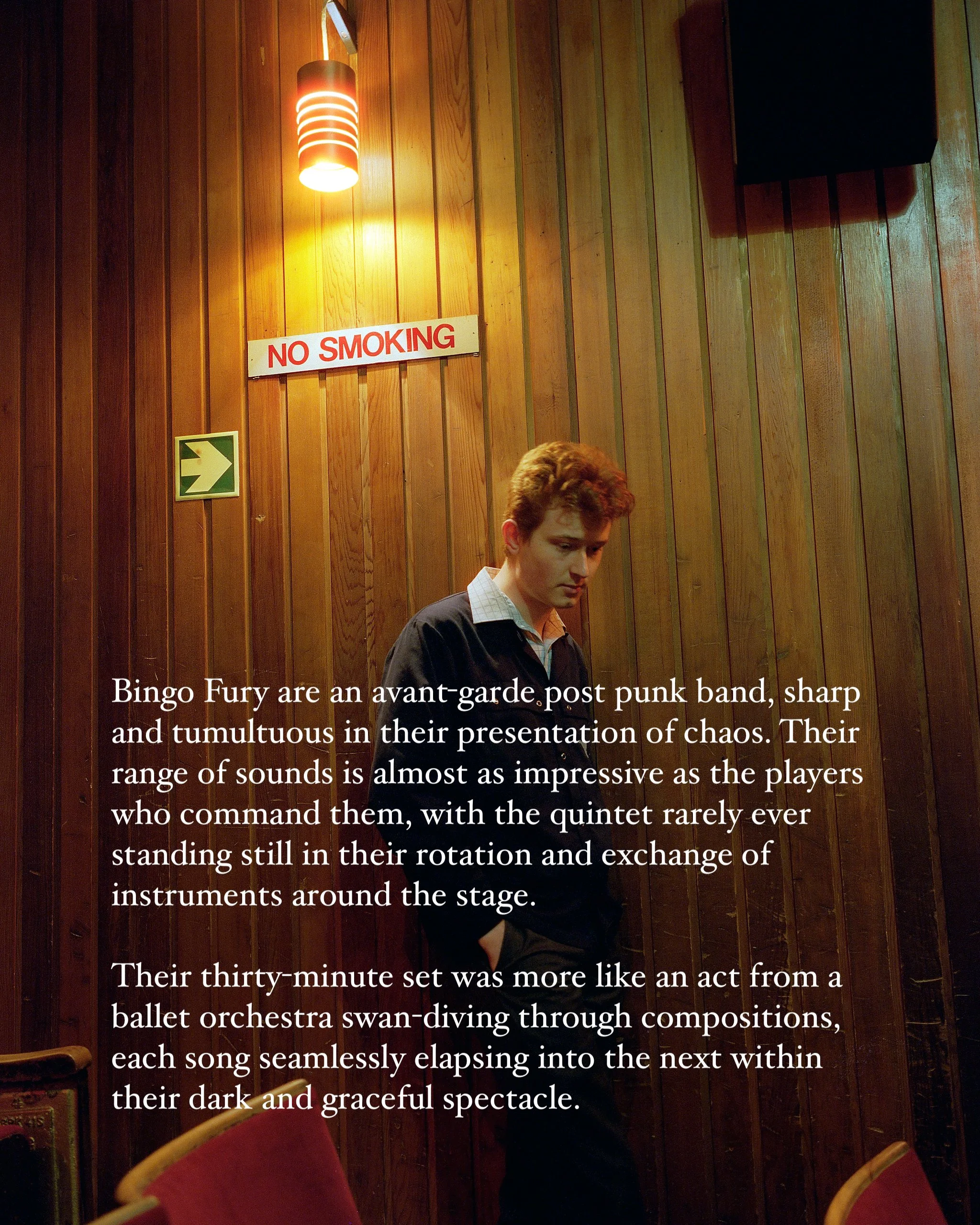 Their music is a cacophony of tom-heavy drums and jaunty guitars, unnerving pianos and clattering percussion clashing with the wild musings of cornet player Harry ‘Iceman’ Furniss (local avant-jazz legend from their hometown of Bristol). During the most intense parts of their set, they explode with sounds which confront you in their lack of obvious harmony or unison, reminiscent of other cutting-edge bands from Bristol such as Squid and Lice; yet everything is played with such precision and the band’s chemistry so coordinated that the whole spectacle becomes an orderly chaos, a polished but teetering display on the precipice of collapse. They provide a beautiful experience which sets them above others in their genre who perhaps do not understand their limits, or how to appreciate subtlety like Bingo Fury do.