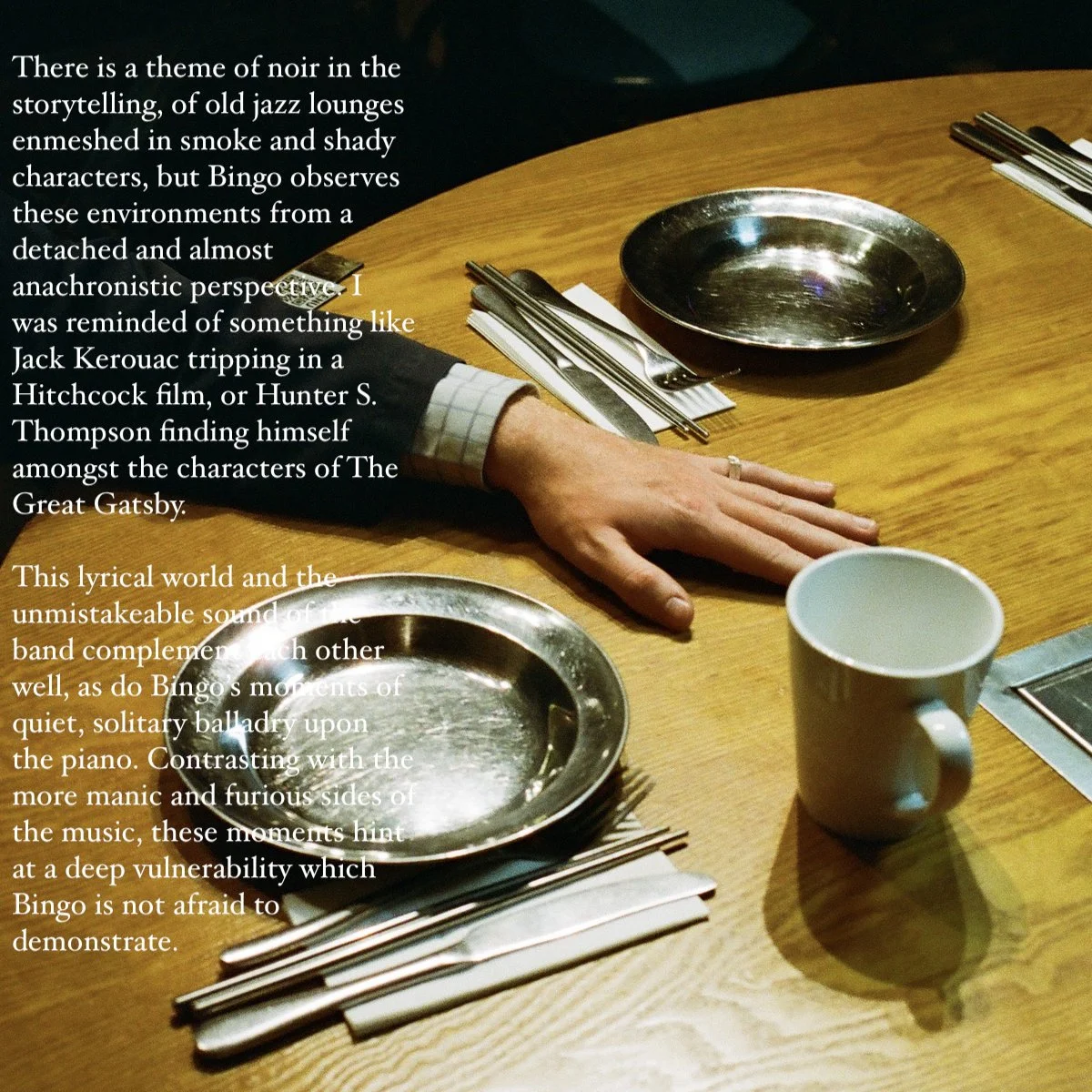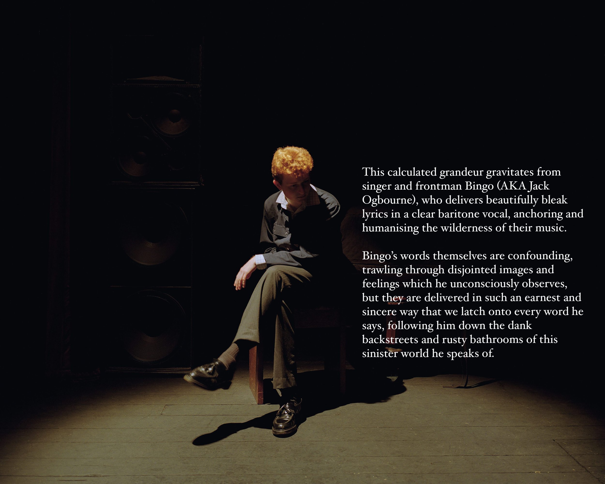 This calculated grandeur gravitates from singer and frontman Bingo (AKA Jack Ogbourne), who delivers beautifully bleak lyrics in a clear baritone vocal, anchoring and humanising the wilderness of their music. Bingo’s words themselves are confounding, trawling through disjointed images and feelings which he unconsciously observes, but they are delivered in such an earnest and sincere way that we latch onto every word he says, following him down the dank backstreets and rusty bathrooms of this sinister world he speaks of. There is a theme of noir in the storytelling, of old jazz lounges enmeshed in smoke and shady characters, but Bingo observes these environments from a detached and almost anachronistic perspective. I was reminded of something like Jack Kerouac tripping in a Hitchcock film, or Hunter S. Thompson finding himself among the characters of the Great Gatsby. This lyrical world and the unmistakeable sound of the band complement each other well, as do Bingo’s moments of quiet, solitary balladry upon the piano. Contrasting with the more manic and furious sides of the music, these ballads hint at a deep vulnerability which Bingo is not afraid to demonstrate.