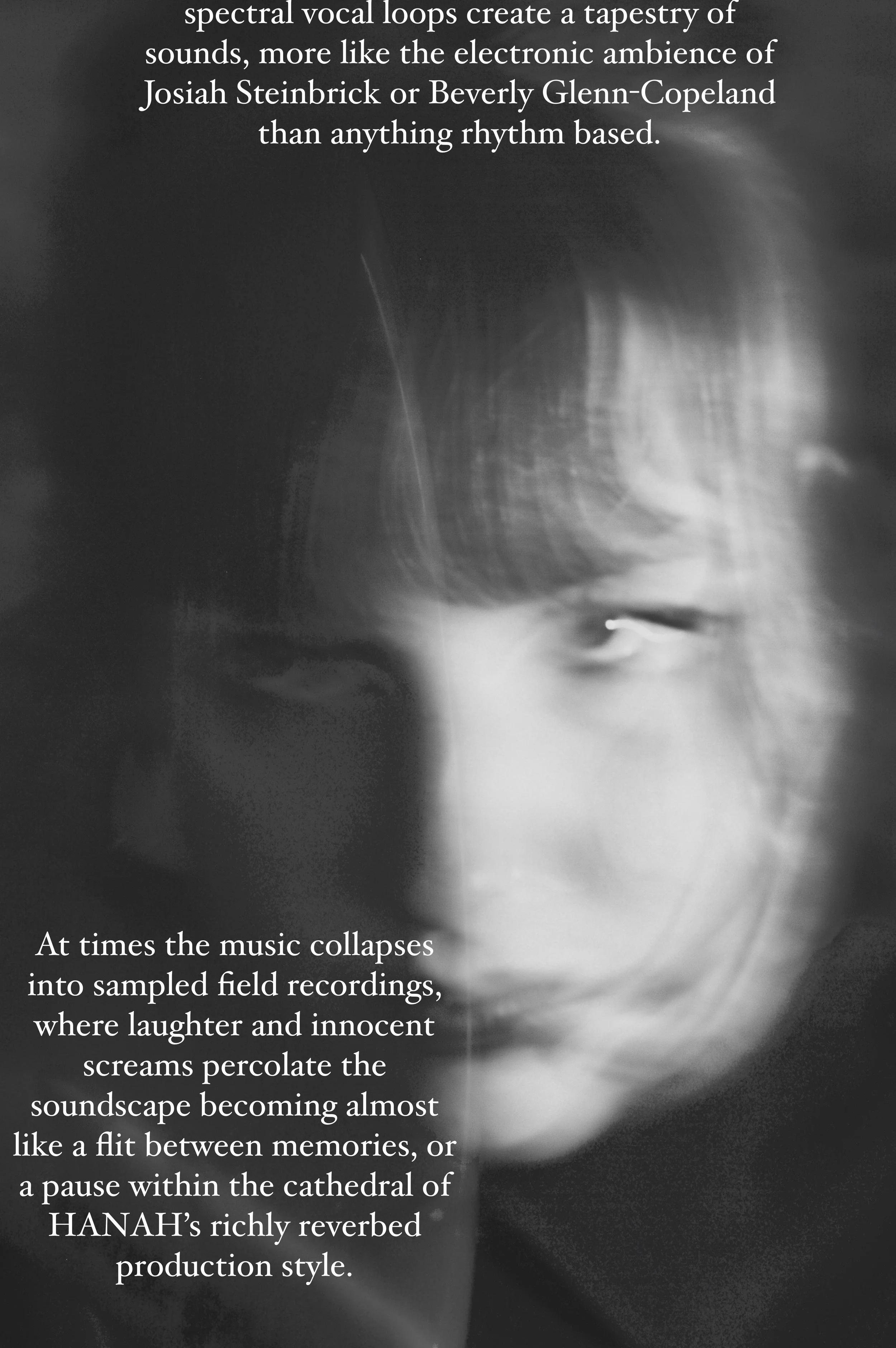 Across the EP, HANAH’s vocals swoon infectiously with melodies of gospel and R&B, especially on lead single Solo, the most beat-driven and uplifting song on the record. But Colours of Now & Then stays very much in the abstract, where warped organs and spectral vocal loops create a tapestry of sounds, more like the electronic ambience of Josiah Steinbrick or Beverly Glenn-Copeland than anything rhythm based. At times the music collapses into sampled field recordings, where laughter and innocent screams percolate the soundscape becoming almost like a flit between memories, or a pause within the cathedral of HANAH’s richly reverbed production style.