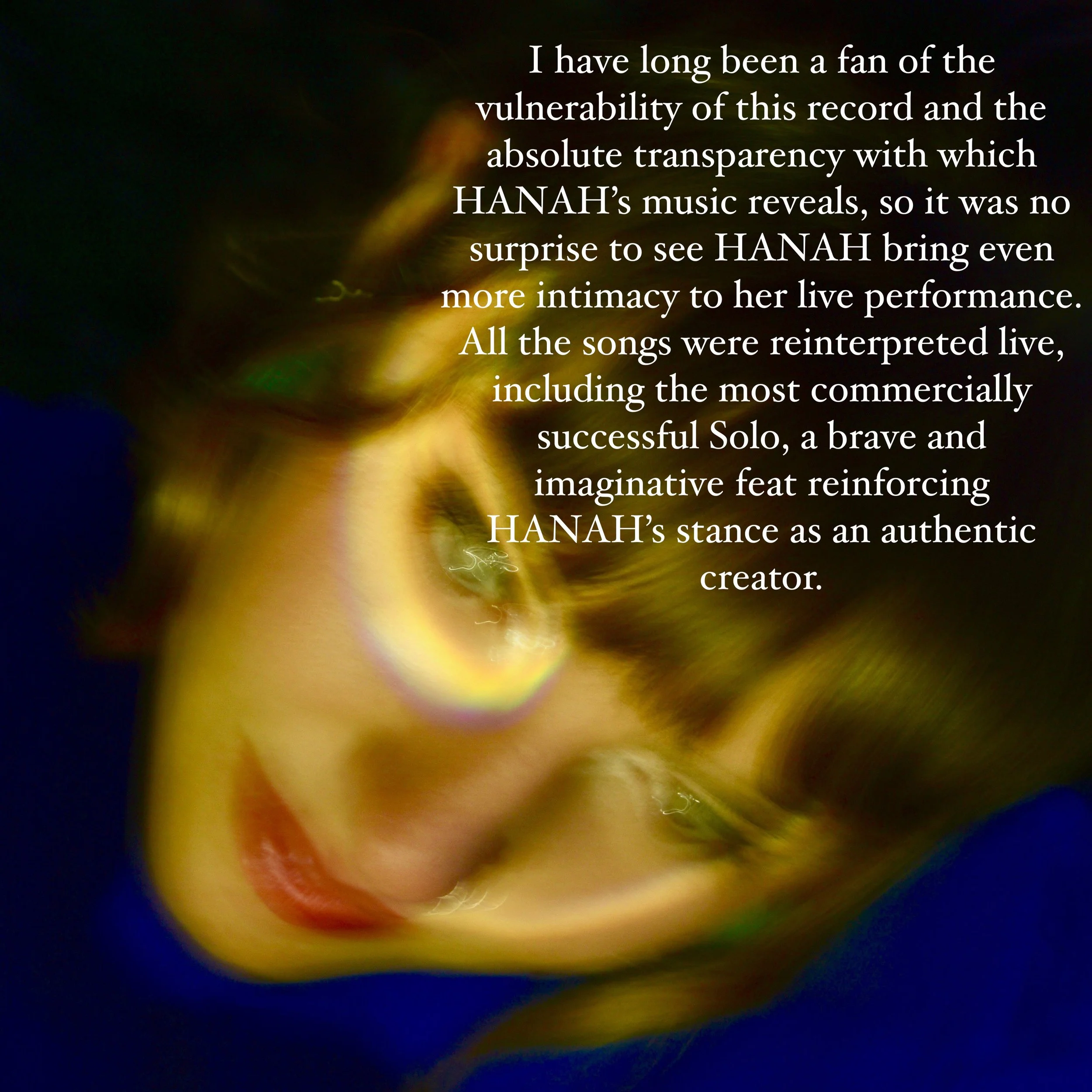 I have long been a fan of the vulnerability of this record and the absolute transparency with which HANAH’s music reveals, so it was no surprise to see HANAH bring even more intimacy to her live performance. All the songs were reinterpreted live, including the most commercially successful Solo, a brave and imaginative feat reinforcing HANAH’s stance as an authentic creator. Some songs were even performed on guitar, absent of the record’s ambience but replaced with a direct connection to HANAH’s heartfelt poetry and raw creative process. The tide ebbed towards folk and more classically written songs, perhaps hinting to what the next project will entail, the next layer to be removed in a search for musical purity.