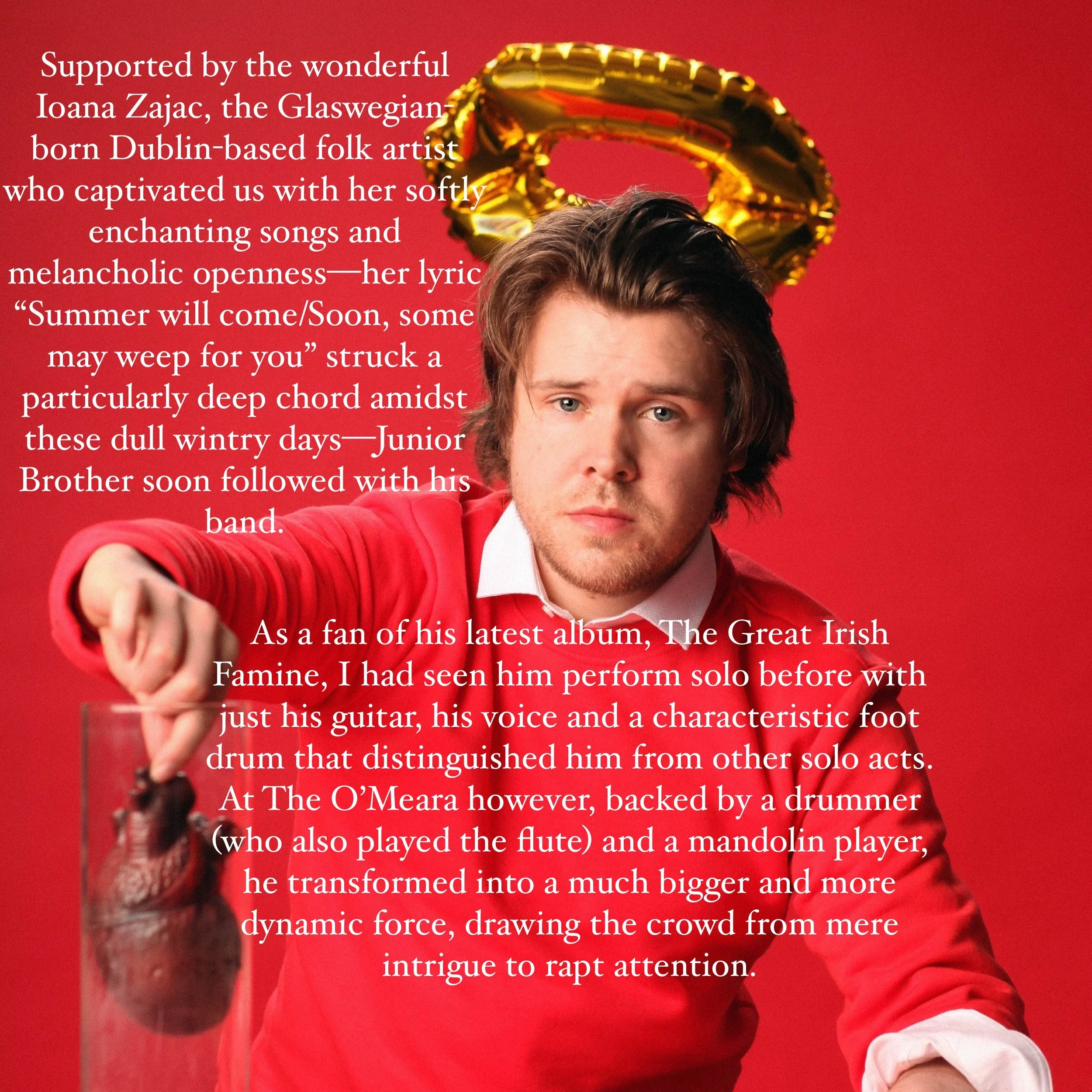 Supported by the wonderful Ioana Zajac, the Glaswegian-born Dublin-based folk artist who captivated us with her softly enchanting songs and melancholic openness — her lyric “Summer will come/Soon, some may weep for you” struck a particularly deep chord amidst these dull wintry days — Junior Brother soon followed with his band. As a fan of his latest album, The Great Irish Famine, I had seen him perform solo before with just his guitar, his voice and a characteristic foot drum that distinguished him from other solo acts. At The O’Meara however, backed by a drummer (who also played the flute) and a mandolin player, he transformed into a much bigger and more dynamic force, drawing the crowd from mere intrigue to rapt attention.