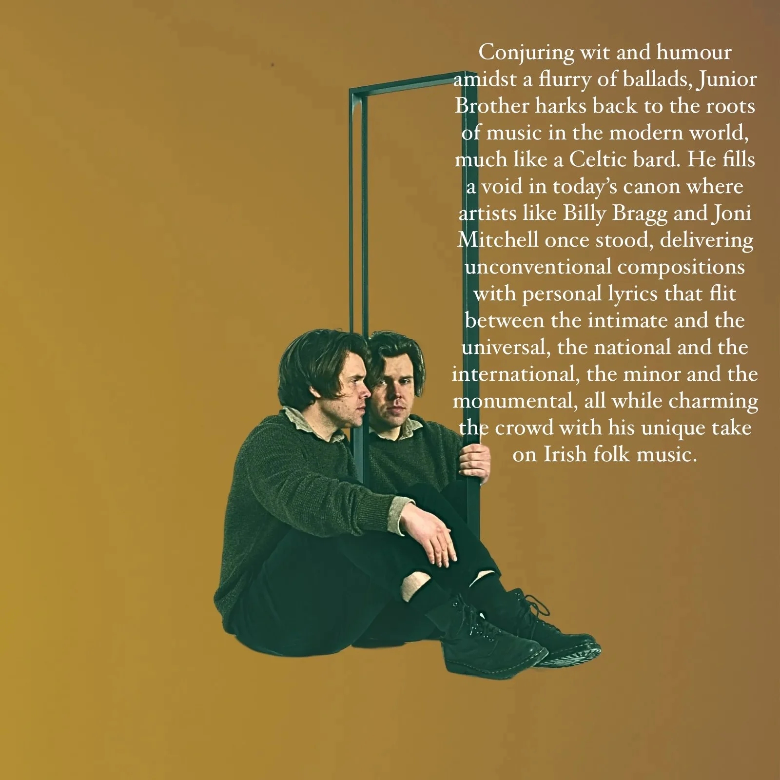 Conjuring wit and humour amidst a flurry of ballads, Junior Brother harks back to the roots of music in the modern world, much like a Celtic bard. He fills a void in today’s canon where artists like Billy Bragg and Joni Mitchell once stood, delivering unconventional compositions with personal lyrics that flit between the intimate and the universal, the national and the international, the minor and the monumental, all while charming the crowd with his unique take on Irish folk music.