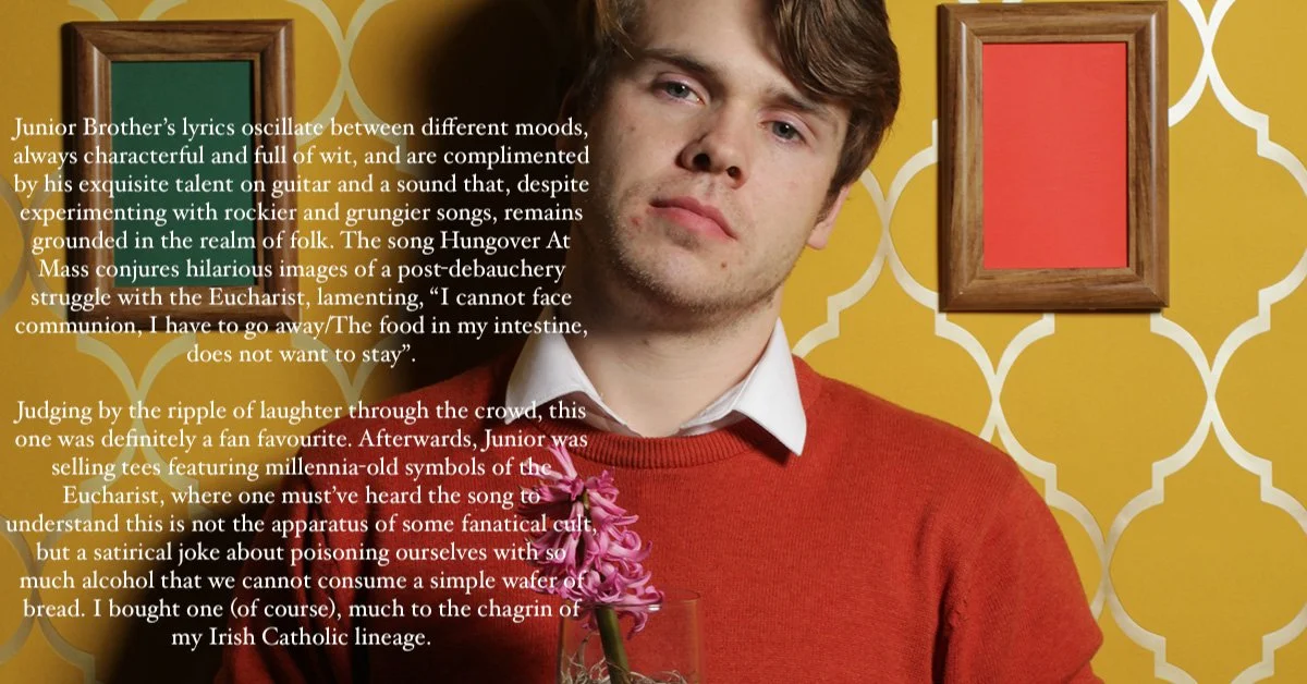 Junior Brother’s lyrics oscillate between different moods, always characterful and full of wit, and are complimented by his exquisite talent on guitar and a sound that, despite experimenting with rockier and grungier songs, remains grounded in the realm of folk. The song Hungover At Mass conjures hilarious images of a post-debauchery struggle with the Eucharist, lamenting, “I cannot face communion, I have to go away/The food in my intestine, does not want to stay”. Judging by the ripple of laughter through the crowd, this one was definitely a fan favourite. Afterwards, Junior was selling tees featuring millennia-old symbols of the Eucharist, where one must’ve heard the song to understand this is not the apparatus of some fanatical cult, but a satirical joke about poisoning ourselves with so much alcohol that we struggle to consume a simple wafer of bread. I bought one (of course), much to the chagrin of my Catholic lineage.