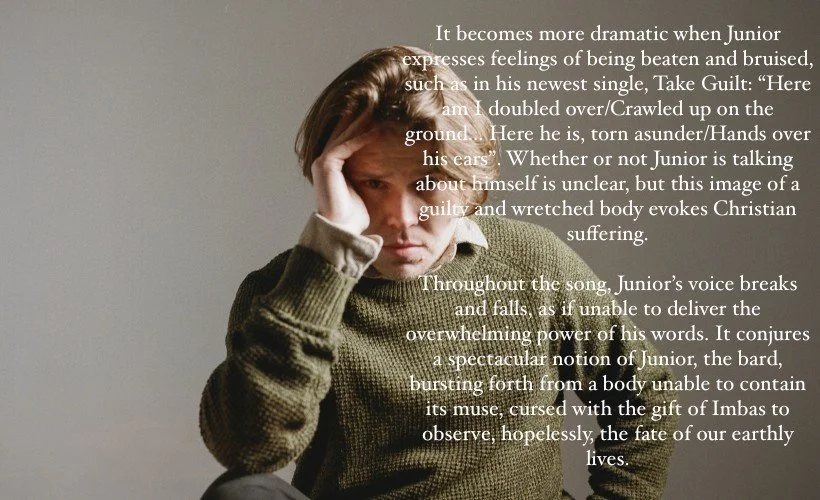 Similarly, in This Is My Body, Junior displays wry self-mockery for being unhealthy and letting himself go, asking, “Stripped from head to toe/How can she love a human potato?”. The audience erupted in laughter, yet also understood the vulnerability of our changing and ageing bodies that resonates with us all. This recurring theme of self-deprecation often contrasts with the beautifully joyous and climactic music, creating a poignant tension. It becomes more dramatic when Junior expresses feelings of being beaten and bruised, such as in his newest single, Take Guilt: “Here am I doubled over/Crawled up on the ground… Here he is, torn asunder/Hands over his ears”. Whether or not Junior is talking about himself is unclear, but this image of a guilty and wretched body evokes Christian suffering. Throughout the song, Junior’s voice breaks and falls, as if unable to deliver the overwhelming power of his words. It conjures a spectacular notion of Junior, the bard, bursting forth from a body unable to contain its muse, cursed with the gift of Imbas to observe, hopelessly, the fate of our earthly lives.