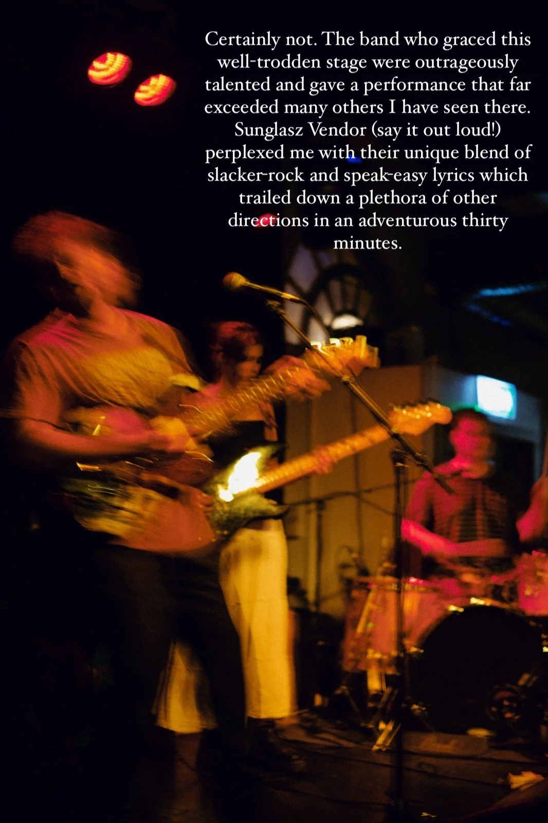 Certainly not. The band who graced this well-trodden stage were outrageously talented and gave a performance that far exceeded many others I have seen there. Sunglasz Vendor (say it out loud!) perplexed me with their unique blend of slacker-rock and speak-easy lyrics which trailed down a plethora of other directions in an adventurous thirty minutes.