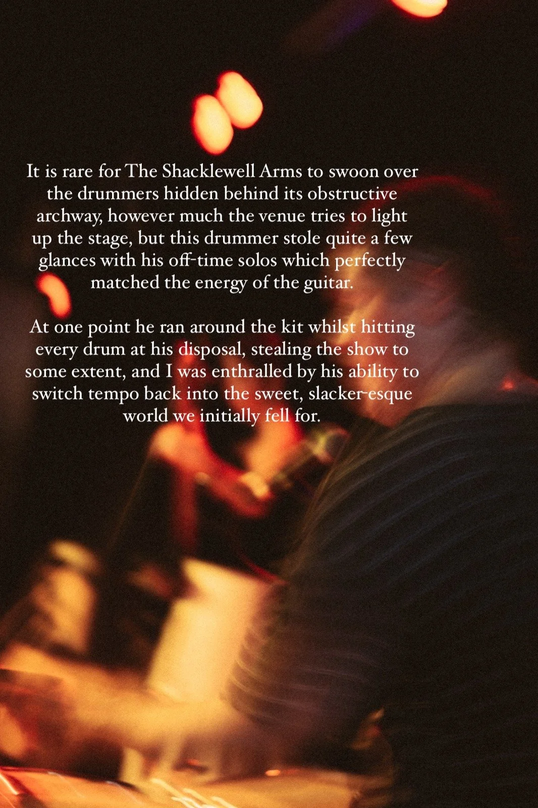 It is rare for The Shacklewell Arms to swoon over the drummers hidden behind its obstructive archway, however much the venue tries to light up the stage, but this drummer stole quite a few glances with their off-time solos which perfectly matched the energy of the guitar. At one point they ran around the kit whilst hitting every drum at their disposal, stealing the show to some extent, and I was enthralled by their ability to switch tempo back into the sweet, slacker-esque world we initially fell for.