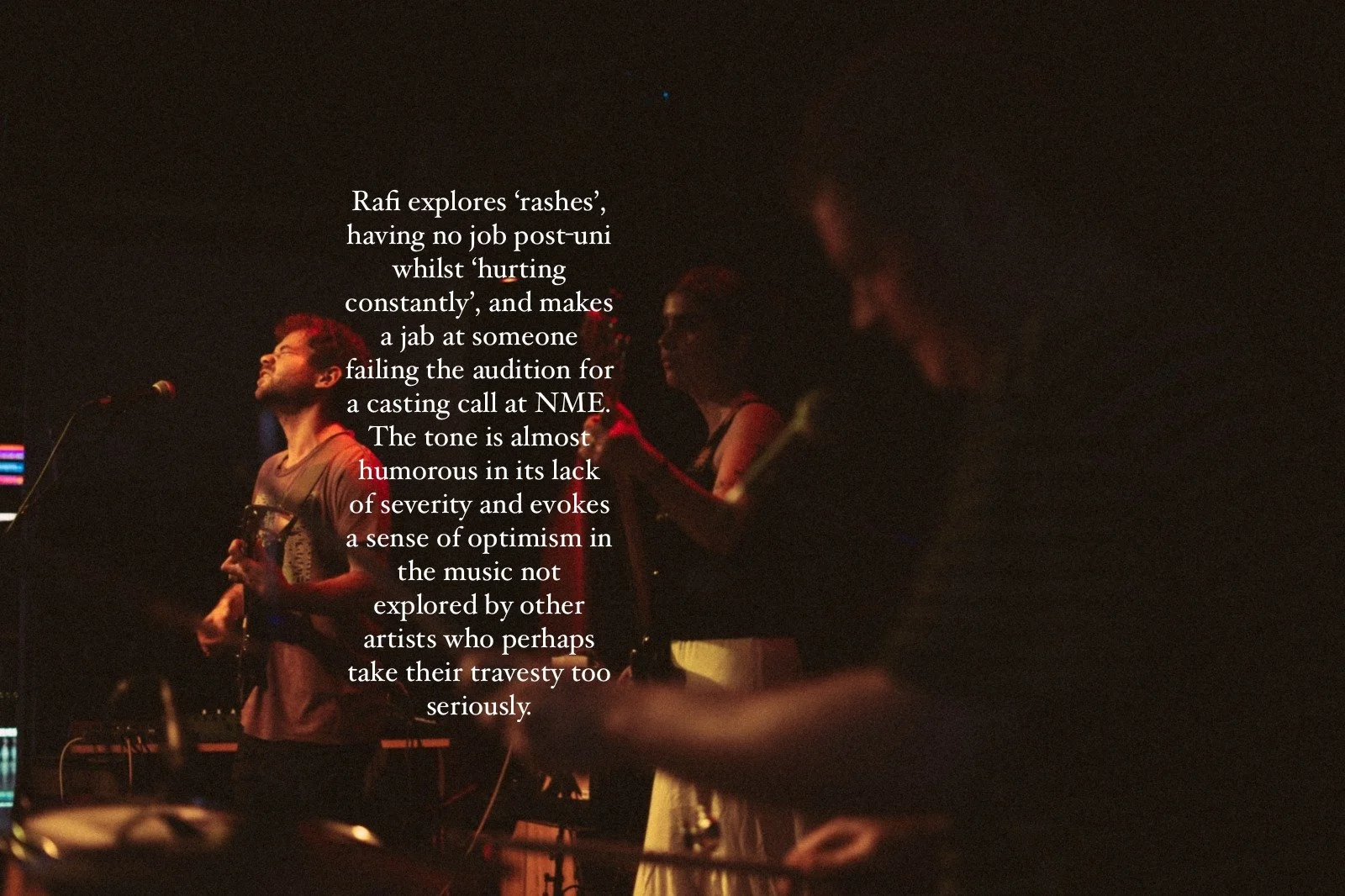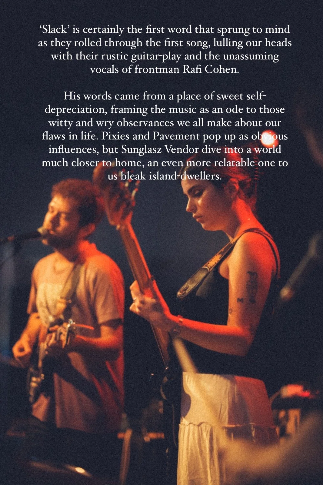‘Slack’ is certainly the first word that sprung to mind as they rolled through the first song, lulling our heads with their rustic guitar-play and the unassuming vocals of frontman Rafi Cohen. His words came from a place of sweet self-depreciation, framing the music as an ode to those witty and wry observances we all make about our flaws in life. Pixies and Pavement pop up as obvious influences, but Sunglasz Vendor dive into a world much closer to home, an even more relatable one to us bleak island-dwellers. Rafi explores forearm rashes, having no job post-uni whilst ‘hurting constantly’, and waiting obediently in the ‘casting call for enemies’. The tone is almost humorous in its lack of severity and evokes a sense of optimism in the music not explored by other artists who perhaps take their travesty too seriously.