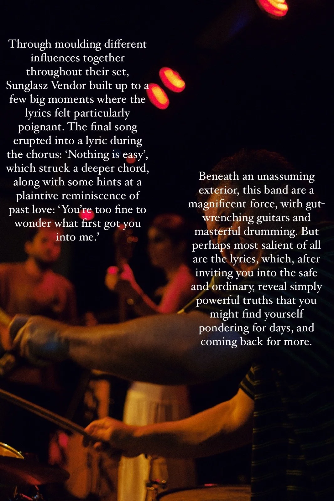 Through moulding different influences together throughout their set, Sunglasz Vendor built up to a few big moments where the lyrics felt particularly poignant. The final song erupted into a lyric during the chorus: ‘Nothing is easy’, which struck a deeper chord, along with some hints at a plaintive reminiscence of past love: