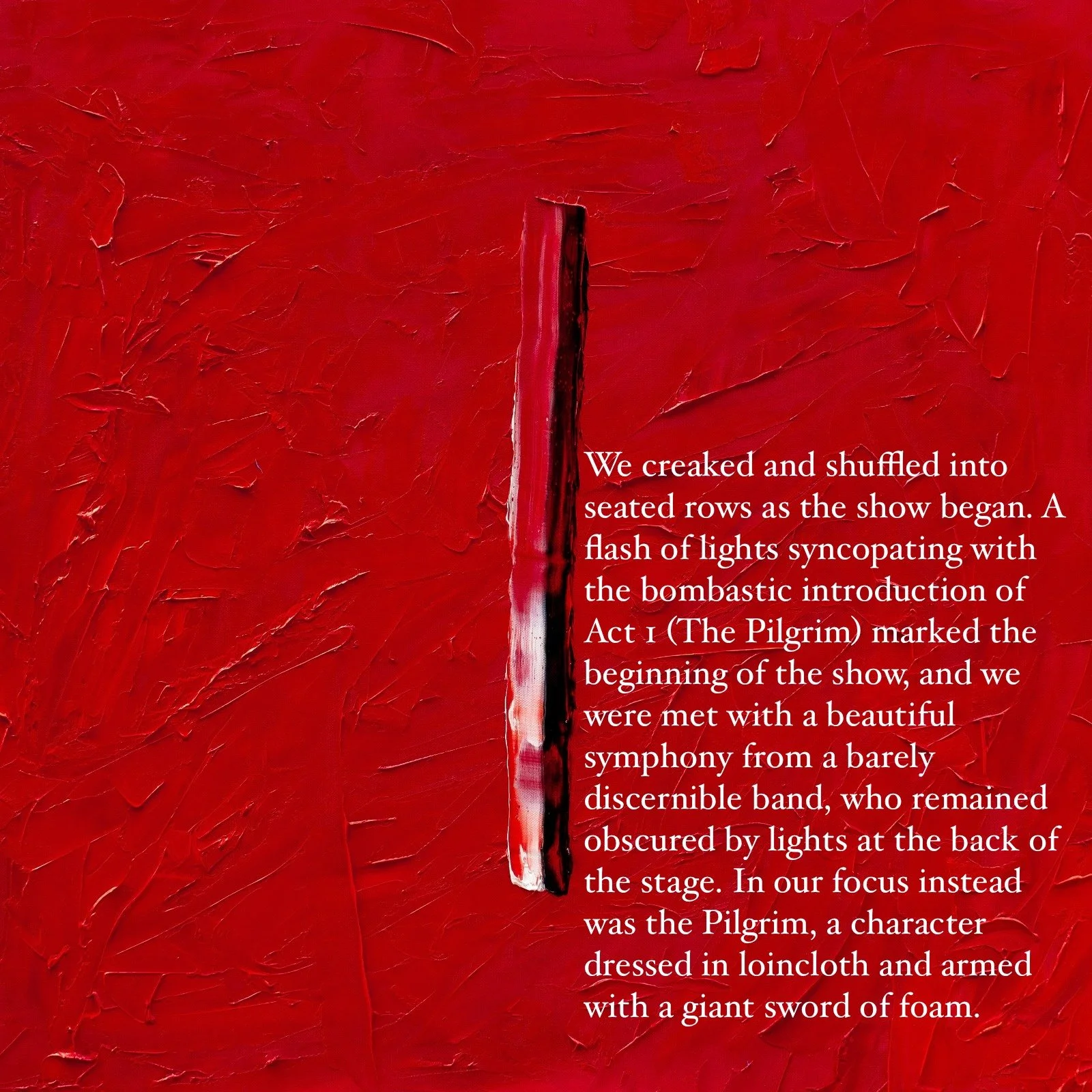 We creaked and shuffled into seated rows as the show began. A flash of lights syncopating with the bombastic introduction of Act 1 (The Pilgrim) marked the beginning of the show, and we were met with a beautiful symphony from a barely discernible band, who remained obscured by lights at the back of the stage. In our focus instead was the Pilgrim, a character dressed in loincloth and armed with a giant sword of foam. The Pilgrim dramatically swooned and danced across the stage as the band played chronologically through their album, introducing various characters along the way. Lasting just over an hour, the show felt too short, so richly meaningful and well-orchestrated was every piece.