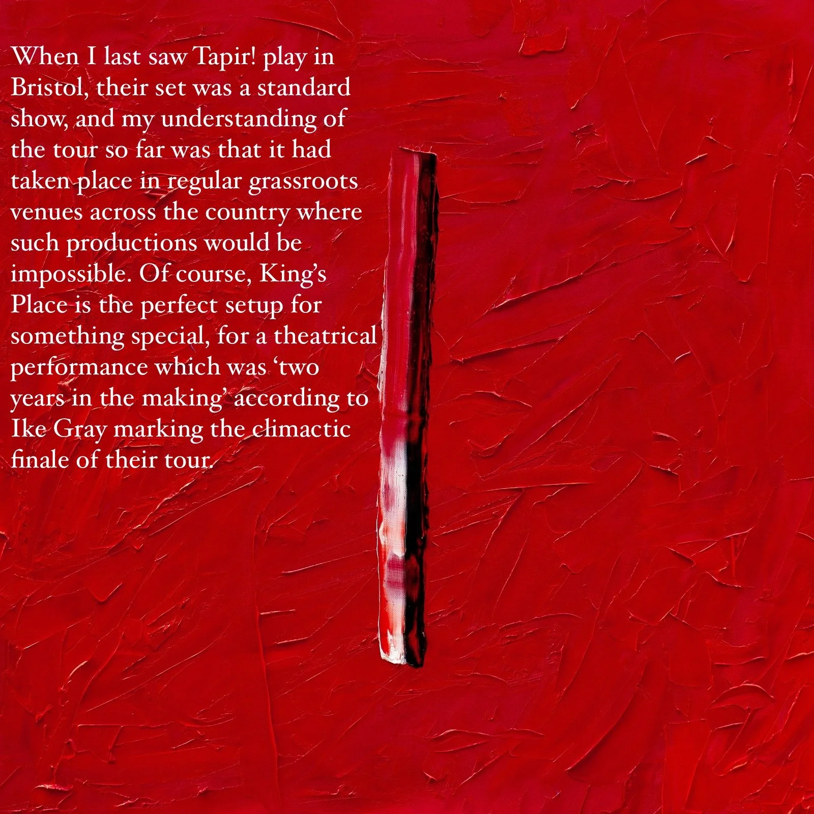 Tapir! delivered a show for the ages at King’s Place, combining Pilgrims, Gods and Mountains into a theatrical production which rather upstaged the expectations of this quiet and modest band.